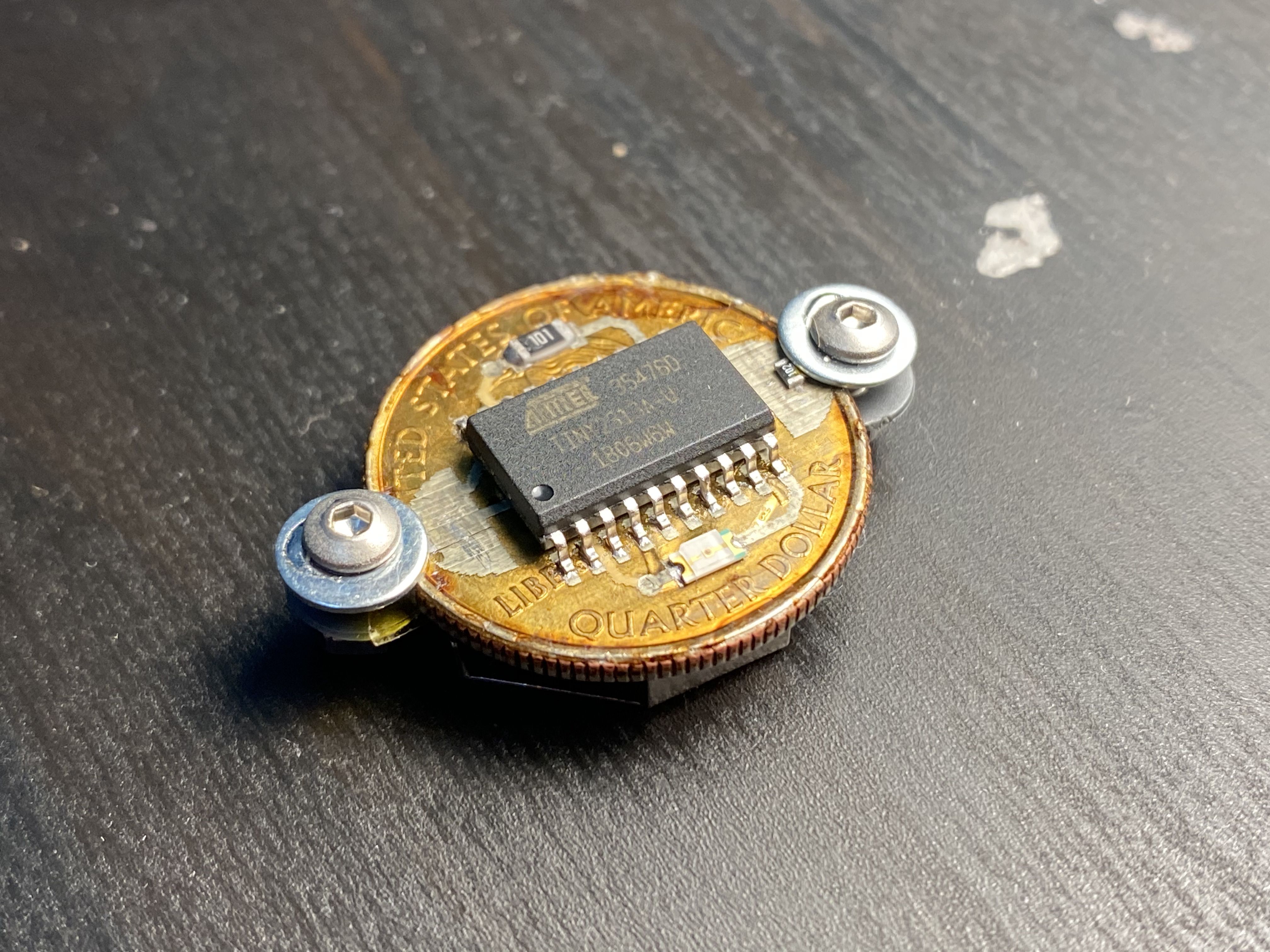 The venerable Atmel ATTINY2313a was employed for this build, and it fit quite nicely. Personally I like FDR more, but we didn't have any ATTINY85s. Lincoln would have been the most appropriate President as he is the only President with a patent, and copper is the most efficient thermal and electrical conductor. However, the 25-cent piece had the most real estate which would make PCB layout a more comfortable experience.