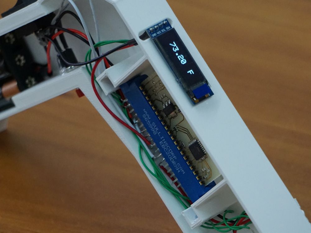 At the heart of the thermometor is an ATMEGA328-P chip which uses I2C pheripherals such as an OLED display and an MLX90614 infrared thermometer sensor to measure IR radiation from an object. Stored on the IC is a table that turns analog data from the IR sensor into approximate temperature values which is displayed on an OLED display at the top of the device.